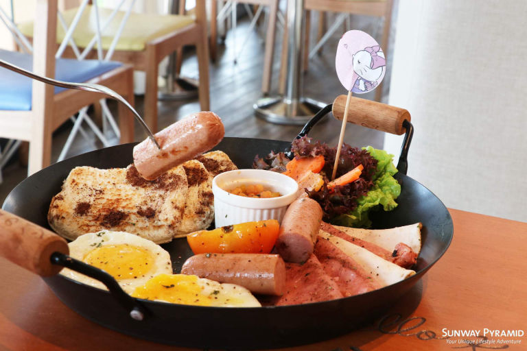 Dig into this heartwarming combination of Kitty-shaped toast, sausages, ham, eggs, baked beans and vegetables, all-day long.