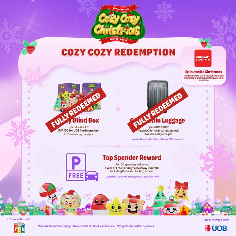 Tier 2 : Spend RM2,000 (RM1,900 for UOB Credit Cardmembers) in 4 same-day receipts to redeem ONE (1) Cozy Cabin Luggage, valid for purchases made at Fashion, Sports, Beauty (Beauty services not included), and F&B outlets in Sunway Pyramid