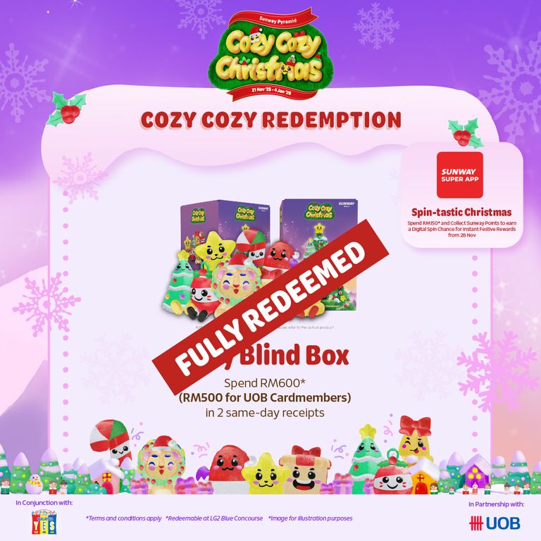 Tier 1 : Spend RM600 (RM500 for UOB Credit Cardmembers) in 2 same-day receipts to redeem ONE (1) Cozy Blind Box; OR