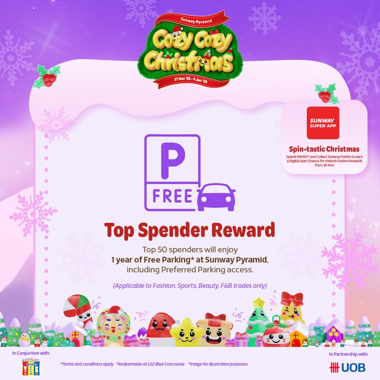 Top Spender Reward : Be among the Top 50 Spenders to enjoy ONE (1) year of Free Parking at Sunway Pyramid, inclusive of Preferred Parking access