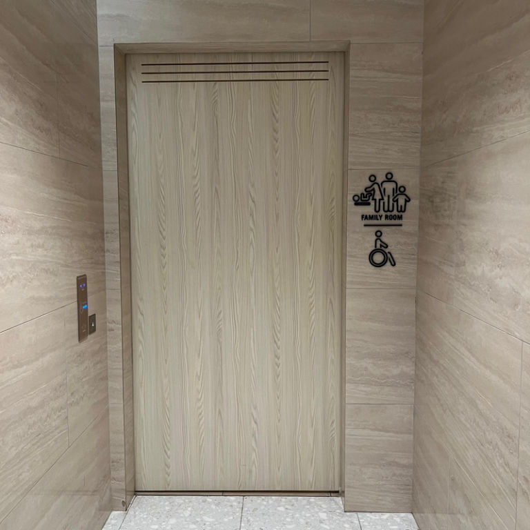 This family washroom is a private restroom space designed for families, offering convenience and comfort for parents with young children, elderly members, or individuals who need assistance. It typically includes child-friendly fixtures, a baby changing station and accessibility features for ease of use by all.