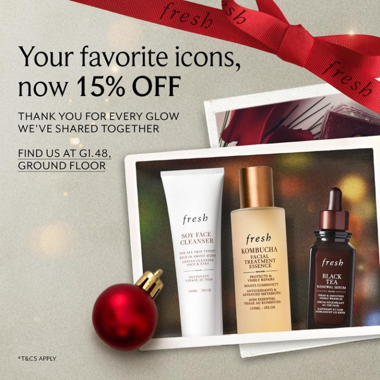 As a thank you for every glow we’ve shared, enjoy 15% off your favourite Fresh icons. Shop the Gratitude Sale from 26 Dec–4 Jan at Fresh boutique, G1.48, Ground Floor.