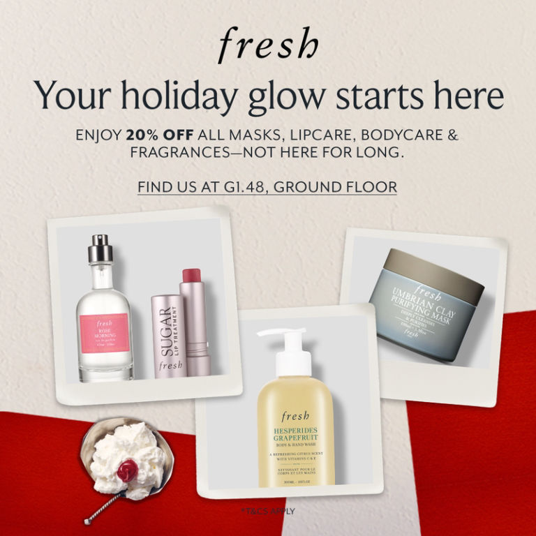 Enjoy 20% off all masks, lip care, body care & fragrances this 2–11 Dec. A limited-time treat to refresh your routine. Visit Fresh boutique at G1.48, Ground Floor to learn more.
