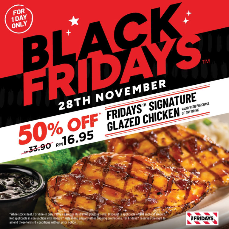 Promo Period: 28 Nov 2025 (1 day only) Black Friday Deal at Fridays🖤 Get 50% OFF Fridays Signature Glazed Chicken, 28 Nov only! While stocks last. For more info, visit fridays.co…