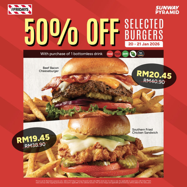 20-21 Jan 2026, only at TGI Fridays Sunway Pyramid outlet: 50% off selected burgers with purchase of any Coca-cola bottomless drinks Choices: Beef Bacon Cheeseburger and Southern…