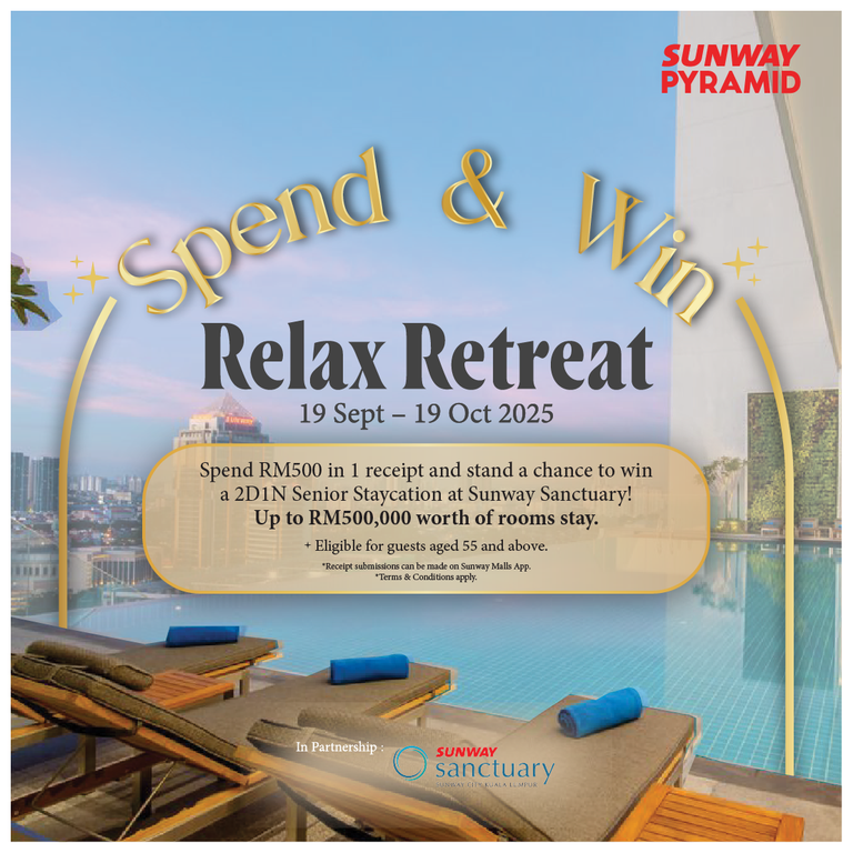 With over RM500,000 worth of stays to be won! From 19 Sept – 19 Oct 2025, just spend RM500 in a single receipt* at Sunway Malls and your parents could enjoy a 2D1N Senior Staycation at Sunway Sanctuary.